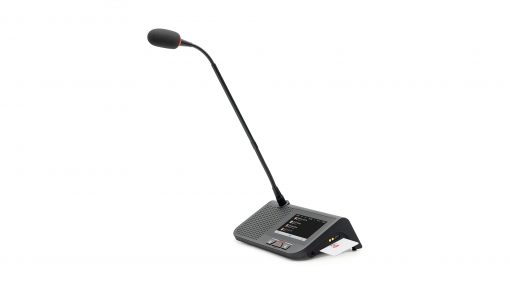 Micrô có vòng đèn LED hai màu, màu đỏ biểu thị trạng thái nói, màu xanh lá cây biểu thị yêu cầu nói.