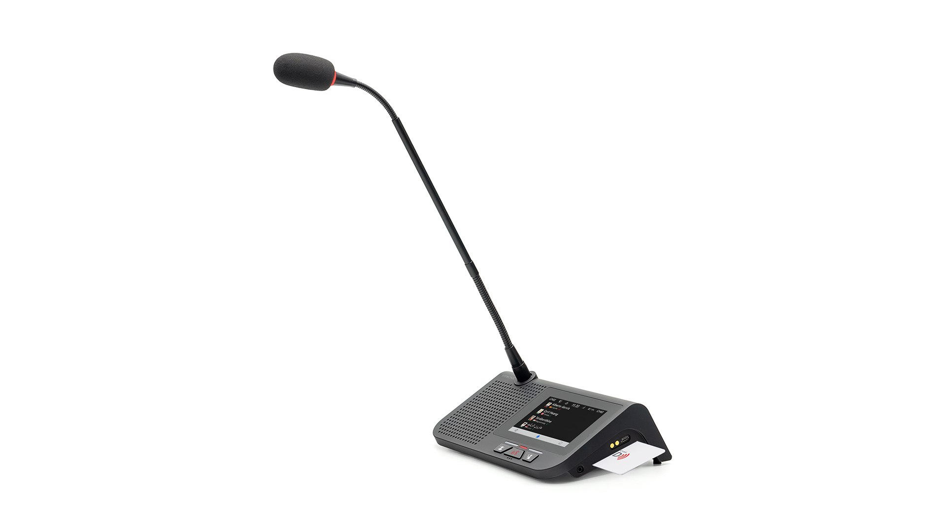 Màn hình cảm ứng không dây WiFi CLEACON V2 mới, có màn hình cảm ứng 4,3 inch (Không bao gồm MIC và pin), thông tin màn hình bao gồm danh sách phát biểu, danh sách yêu cầu phát biểu, kết quả bỏ phiếu, cài đặt EQ, v.v., đế thiết bị này hỗ trợ cả kết nối có dây và không dây, với cáp CAT5 để hoạt động như thiết bị có dây và sạc pin. Nhận dạng thẻ IC.